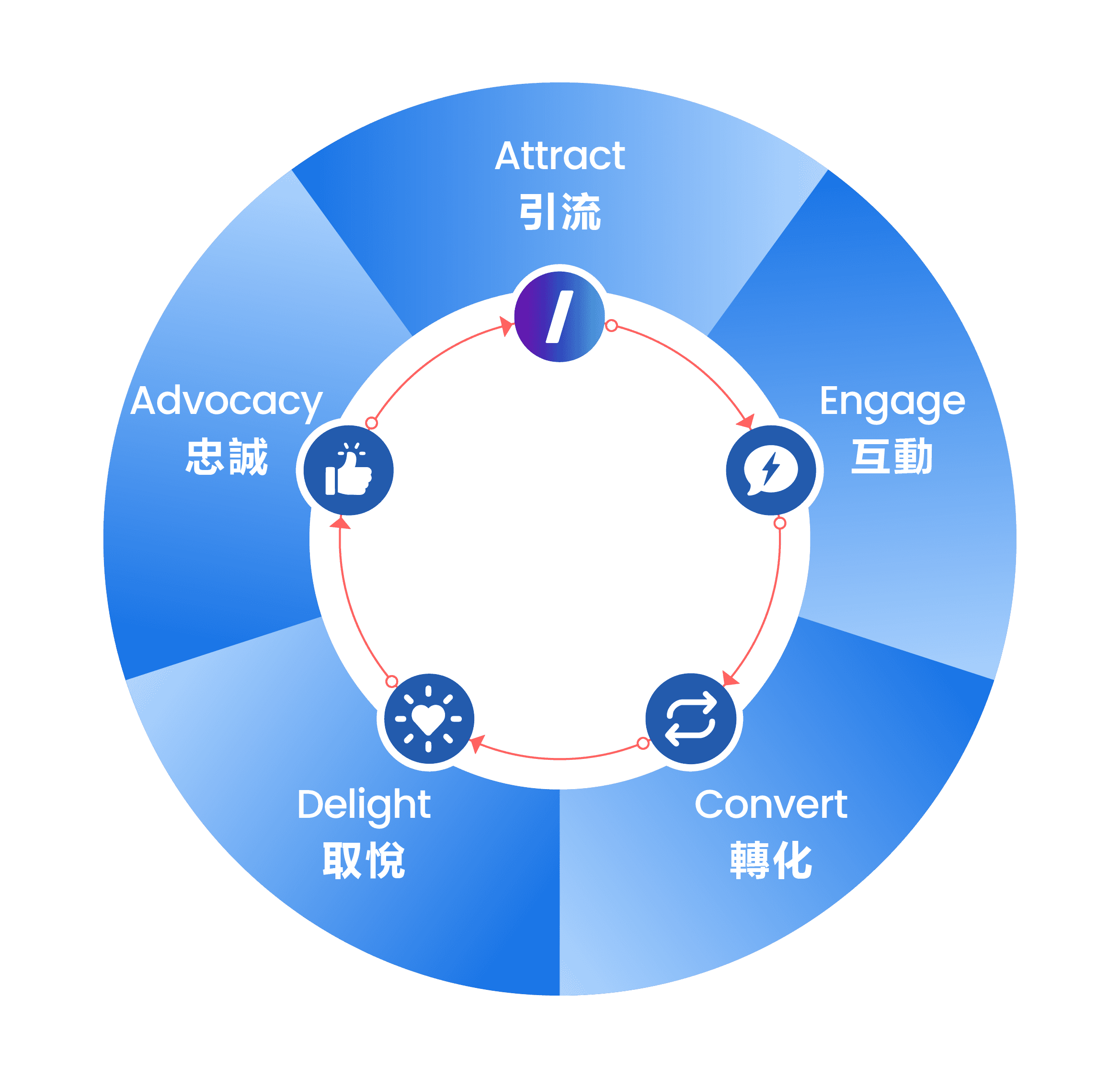 Attract → Engage → Convert → Delight → Advocacy → (back to Attract)
