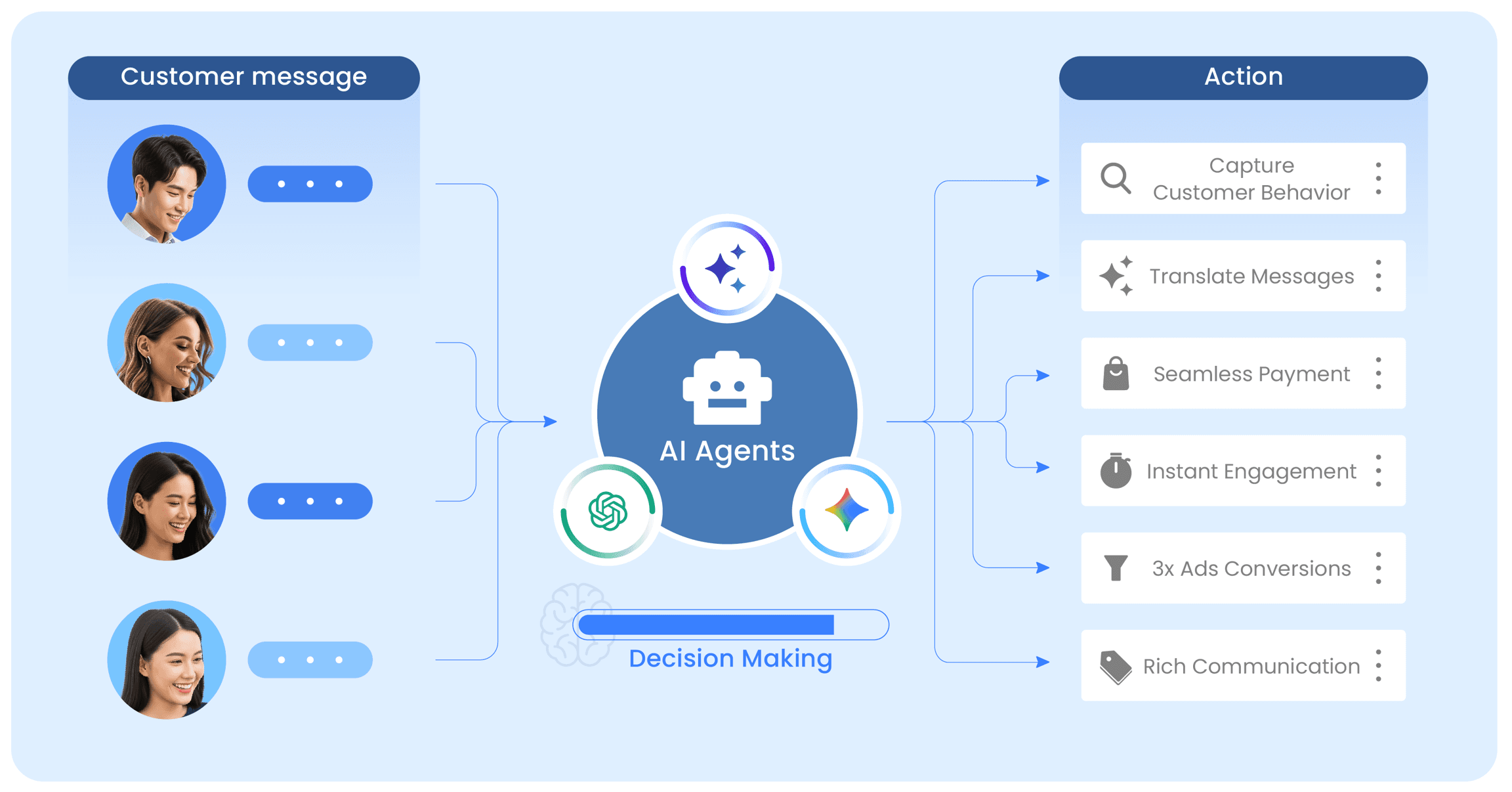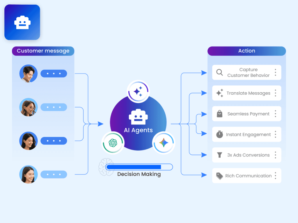AI Agents think, decide, and act within defined business logic.