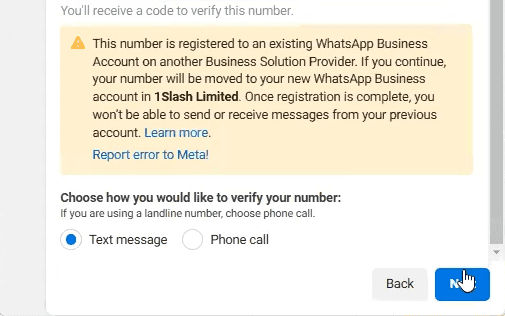 You'll be prompted about an existing WABA on this number, if you continue, your number will be moved to your new WABA in 1Slash Limited.