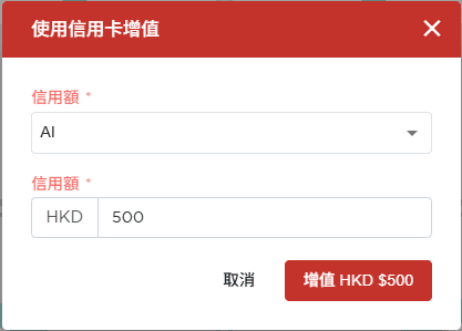 在「使用信用卡增值」彈窗中,選擇 AI 並輸入要增值的金額