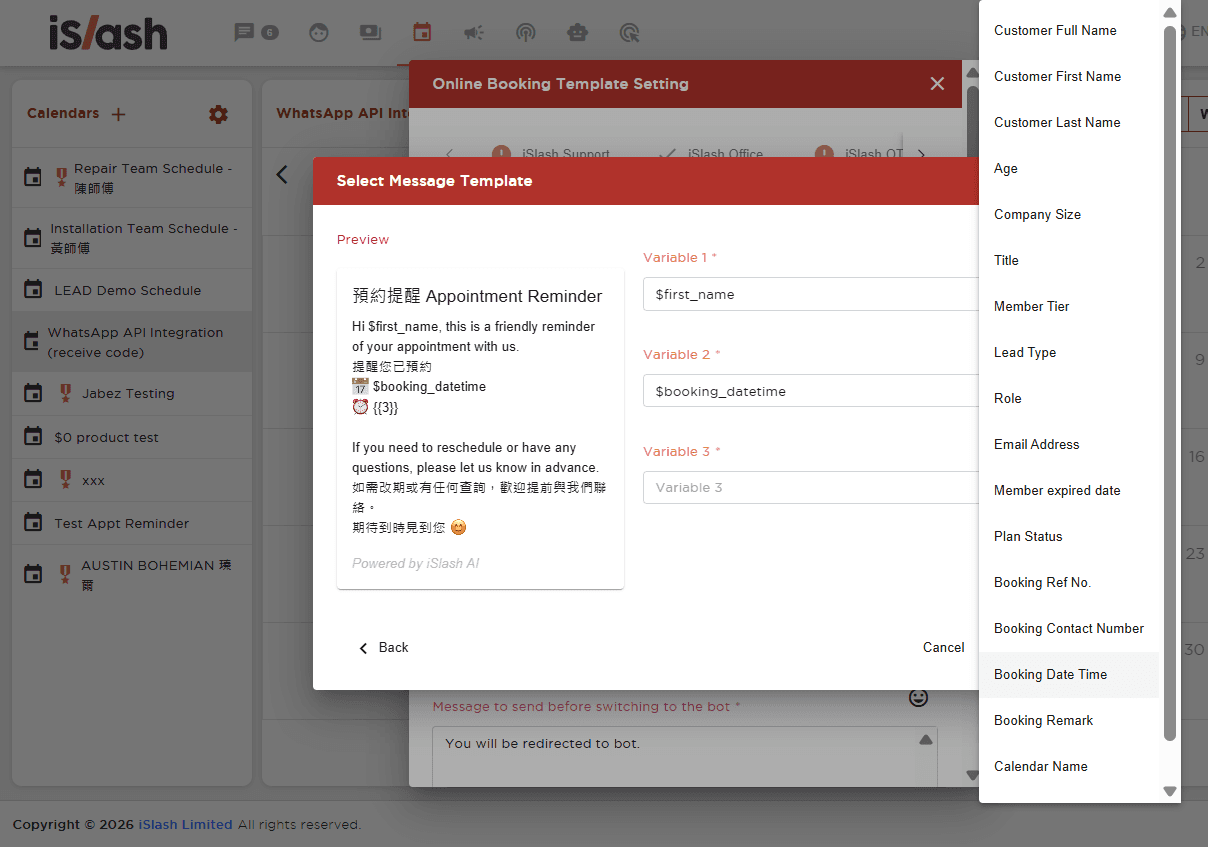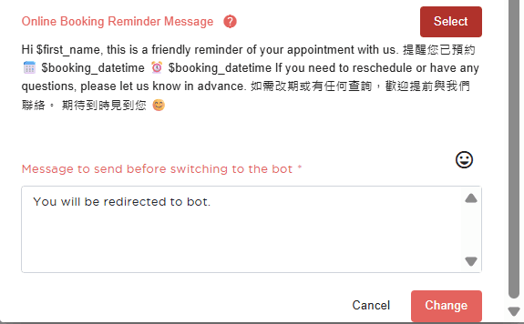 Go to the desired WhatsApp Channel, scroll down to find "Online Booking Reminder Message" and click "Select":