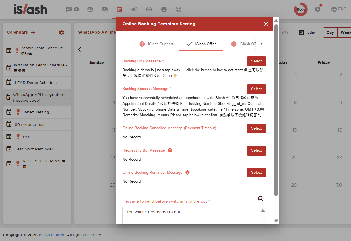iSlash AI’s In-App Calendar helps businesses manage appointments, availability, and customer bookings efficiently, directly connected to WhatsApp and other messaging channels.