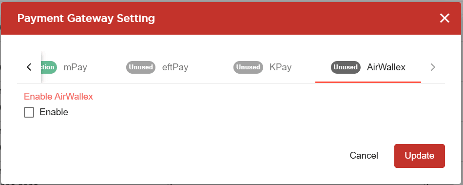 Scroll to the right to find Airwallex, tick the Enable checkbox.