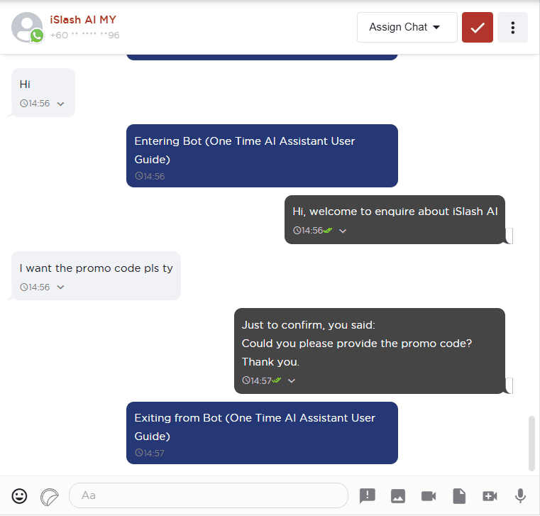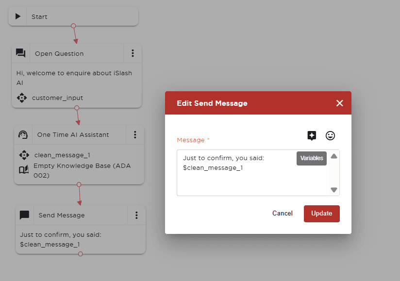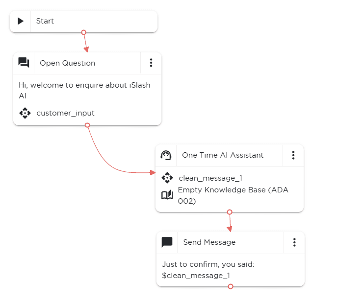 connect the One Time AI Assistant earlier to Send Message.At the top right corner, click Save to complete the AI Agent that is able to process and confirm customer’s message.