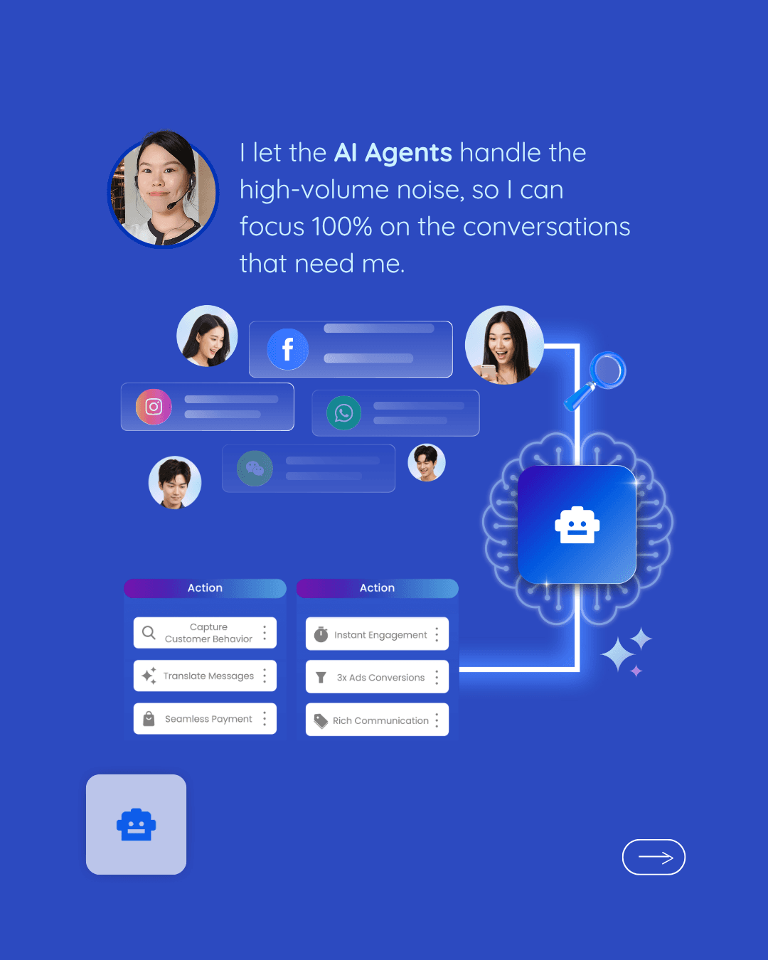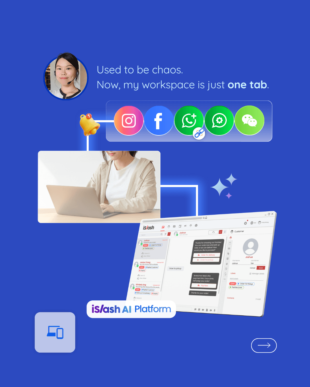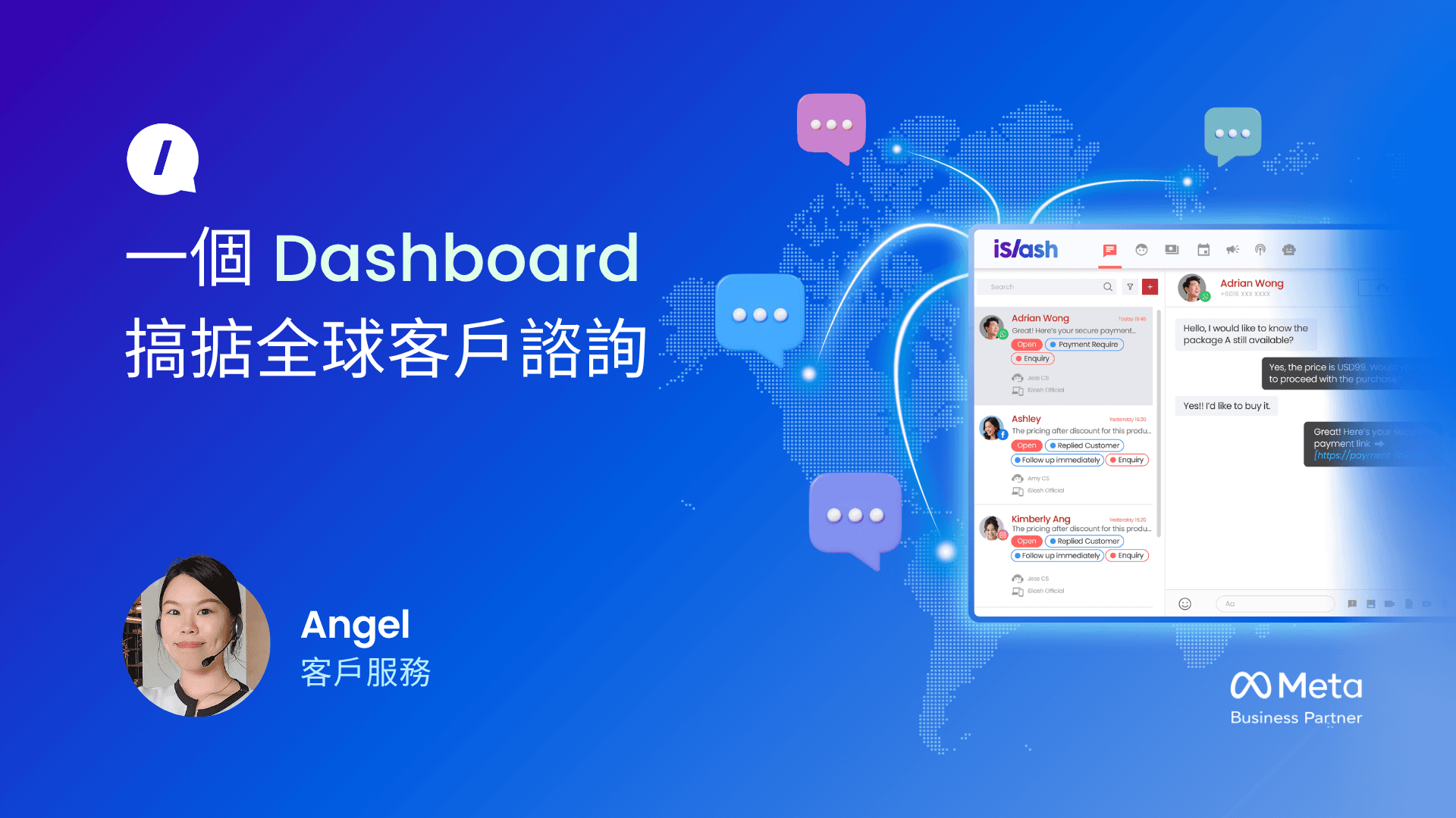 您好,我是 Angel。在 iSlash AI 擔任客戶服務代表期間,我每天需要處理來自 WhatsApp、Facebook Messenger、Instagram DM 以及官網即時通訊套件的大量諮詢。為了達成管理層制定的高標準,我全面仰賴 iSlash AI 平台,確保不遺漏任何潛在客戶,並維持每一次互動的專業水準。