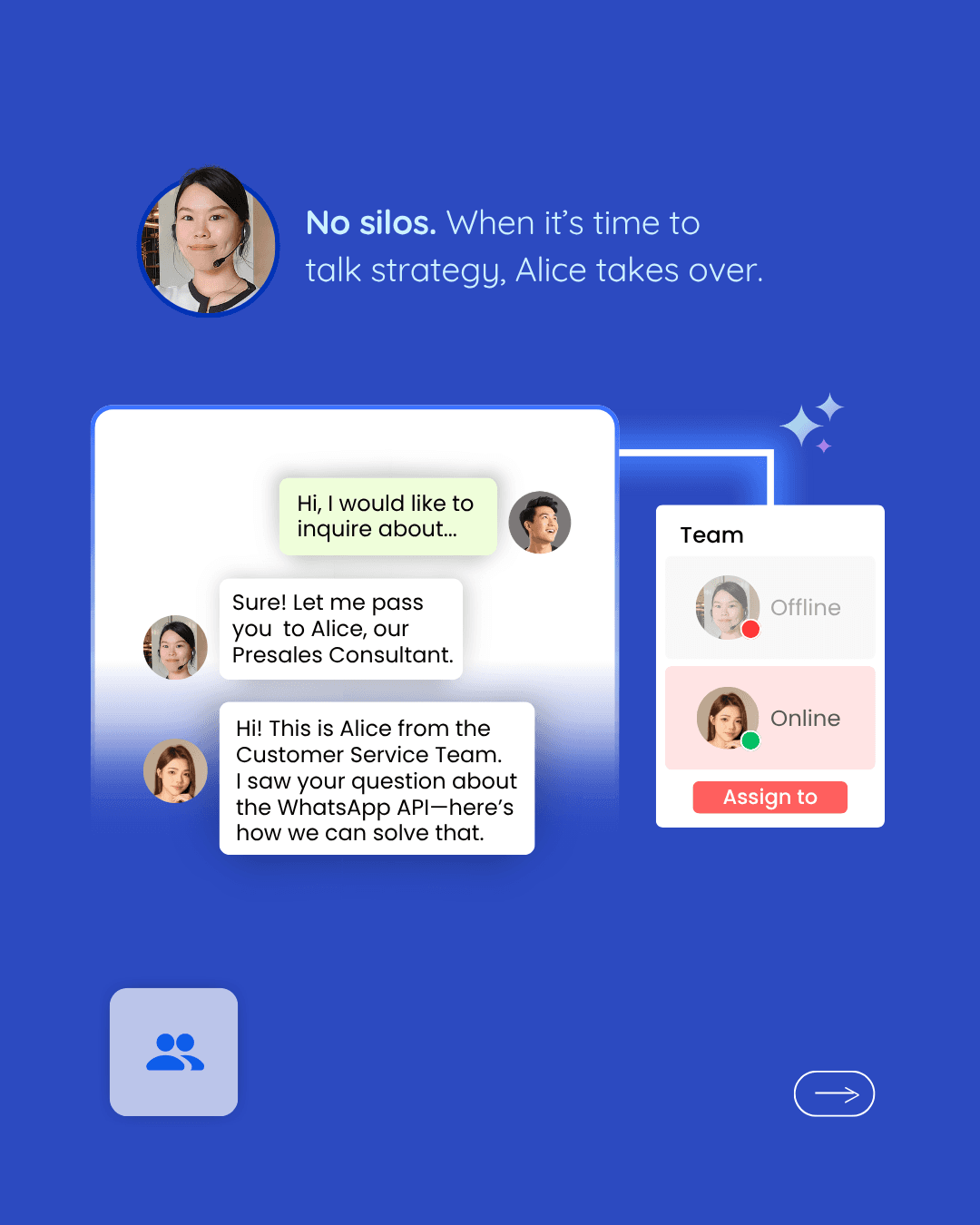 當客戶需要深入的技術探討時,我會直接在平台內將對話指派給我們的售前顧問 Alice。由於儀表板保留了所有先前的對話背景,Alice 在發送第一則訊息前便已掌握完整資訊。客戶無需重複陳述需求,這創造了流暢且專業的過渡體驗,並維持了銷售動能。