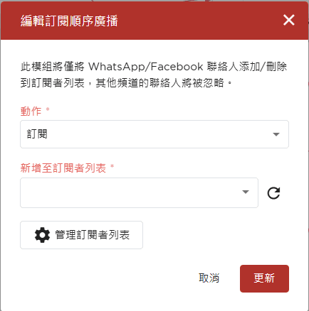 此模組將僅將 WhatsApp/Facebook 聯絡人添加/刪除到訂閱者列表,其他頻道的聯絡人將被忽略。 | ![]() |