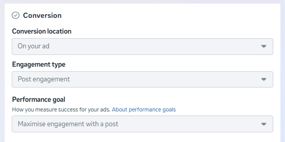 同時,在設定 Meta 廣告時,請務必使用「互動」行銷活動,並搭配以下轉換設定,以達成極大化的貼文留言互動: