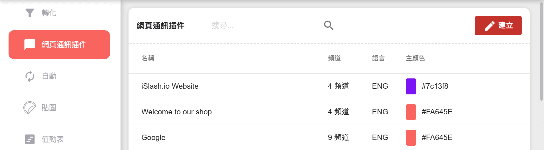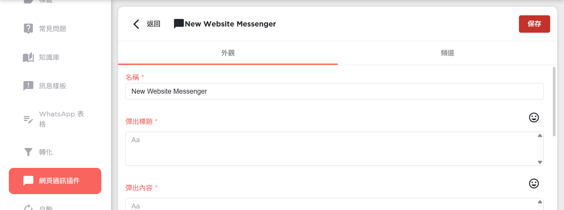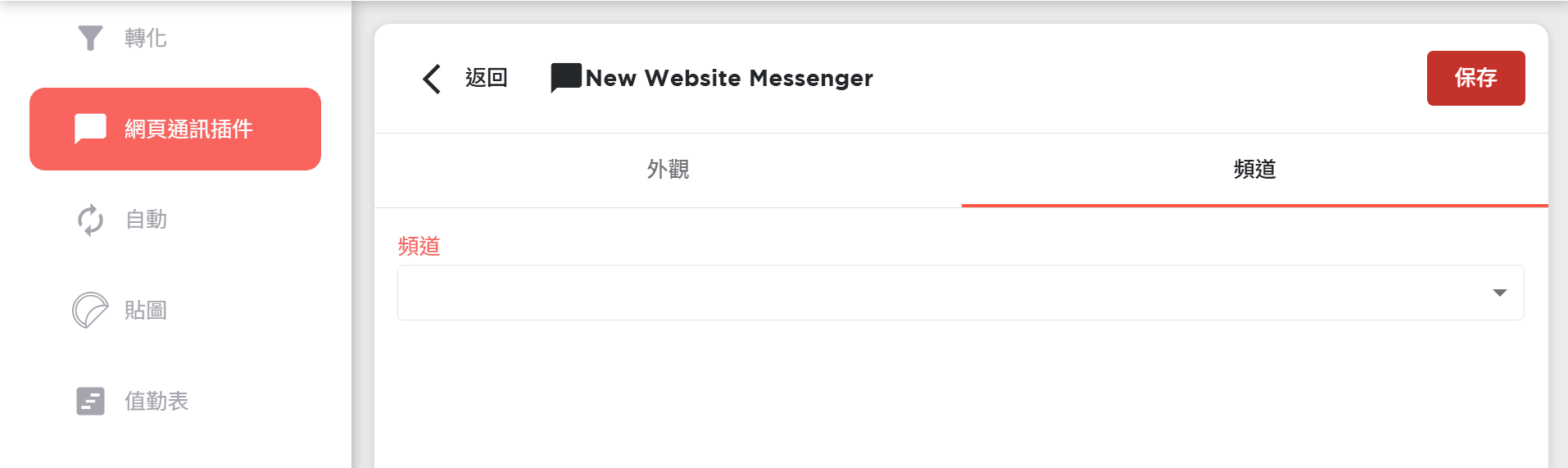 將名稱命名為 「Web」,平台類型選擇「Web」,並點選「儲存」即可建立 Web Plugin Chat 渠道: